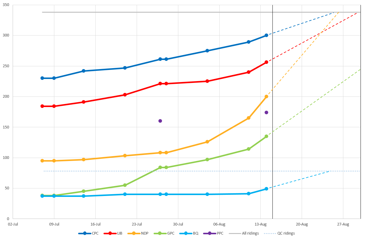 The election date has been set for 20 September. Candidate nominations close 21 days before election day, so parties will have until 30 August to nominate their candidates. 338 candidates are required for a full slate. (Though the Bloc Quรฉbรฉcois only targets Quรฉbec ridings, of which there are 78.)