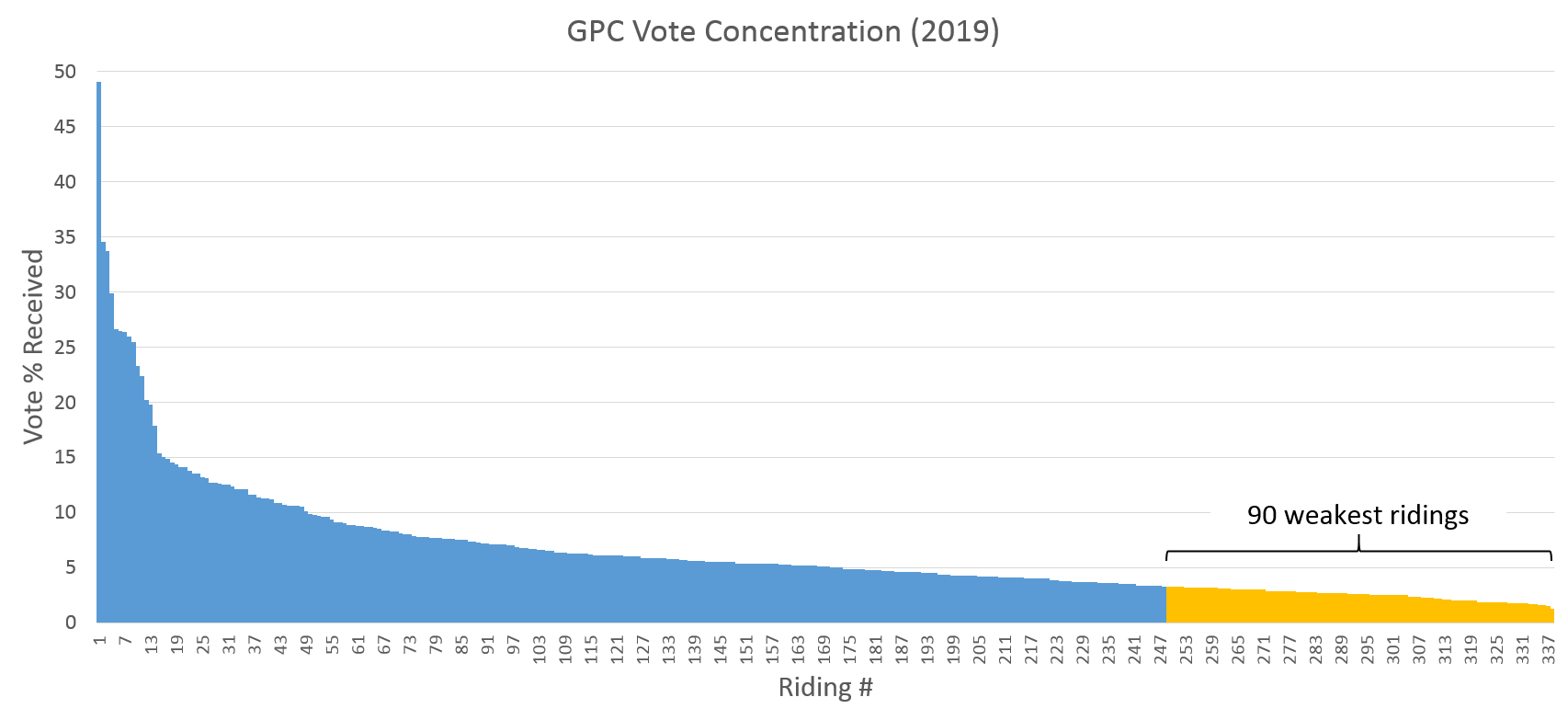 In 2019, the Green Party’s 90 weakest ridings brought in only 10.4% of the party’s total votes. (Much less than 27% of the total votes, as we would have expected if all ridings were equal.) So, to receive 2% of votes cast this election, we would estimate the Greens would need 2.23% actual support. The 0.23% would be lost in ridings without a candidate.