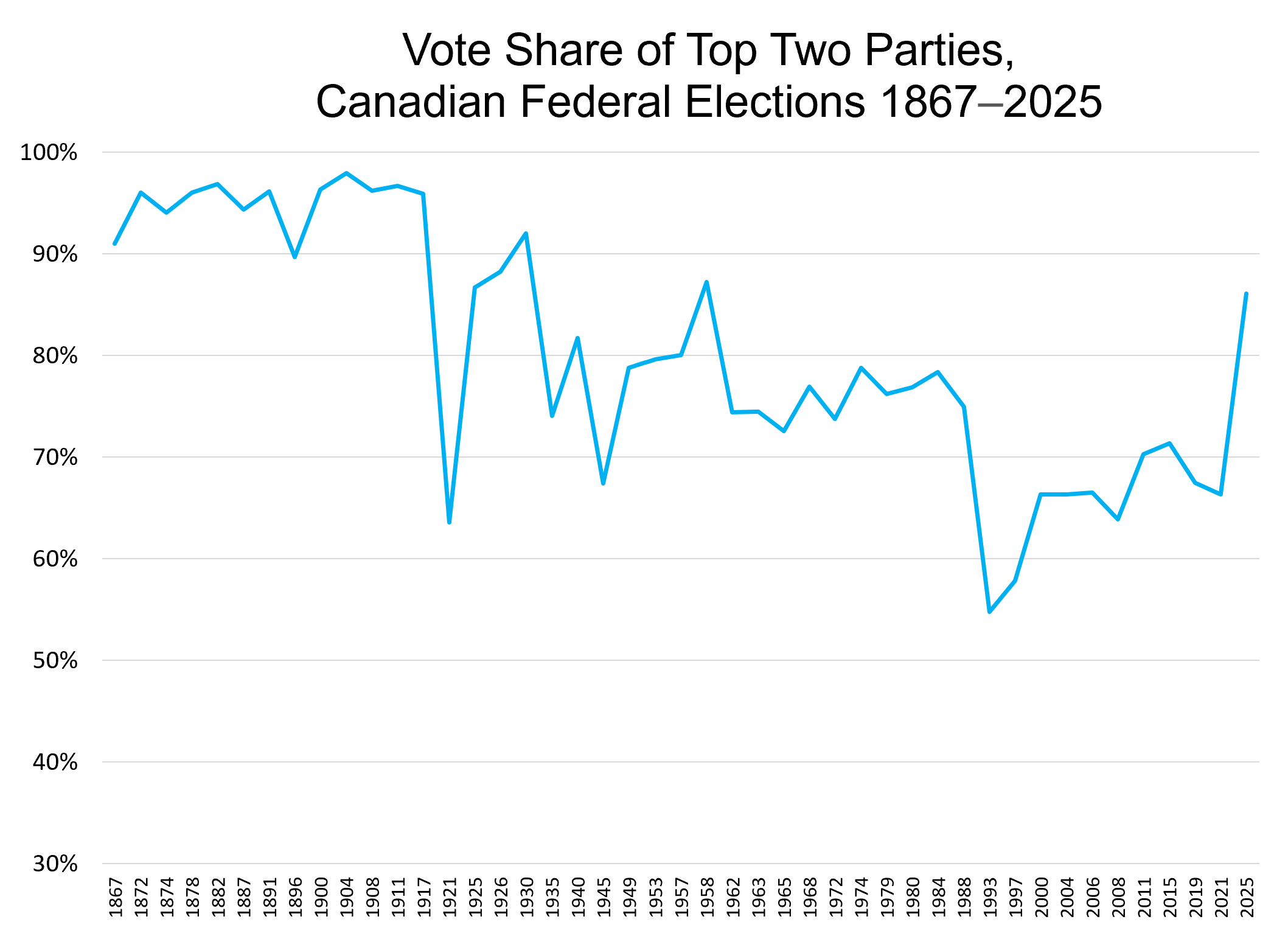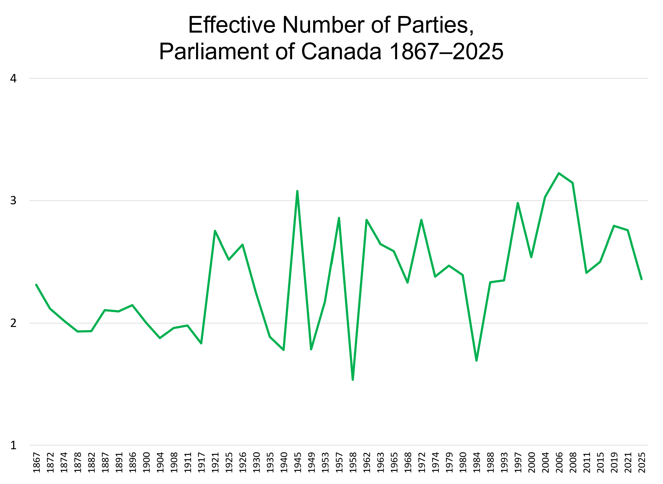 Looking at the big picture, I think there’s good evidence that the 2025 election was a unique event that pushed us closer to a two-party system, but only temporarily. I expect that over the long term, Canada will continue to move in the opposite direction.