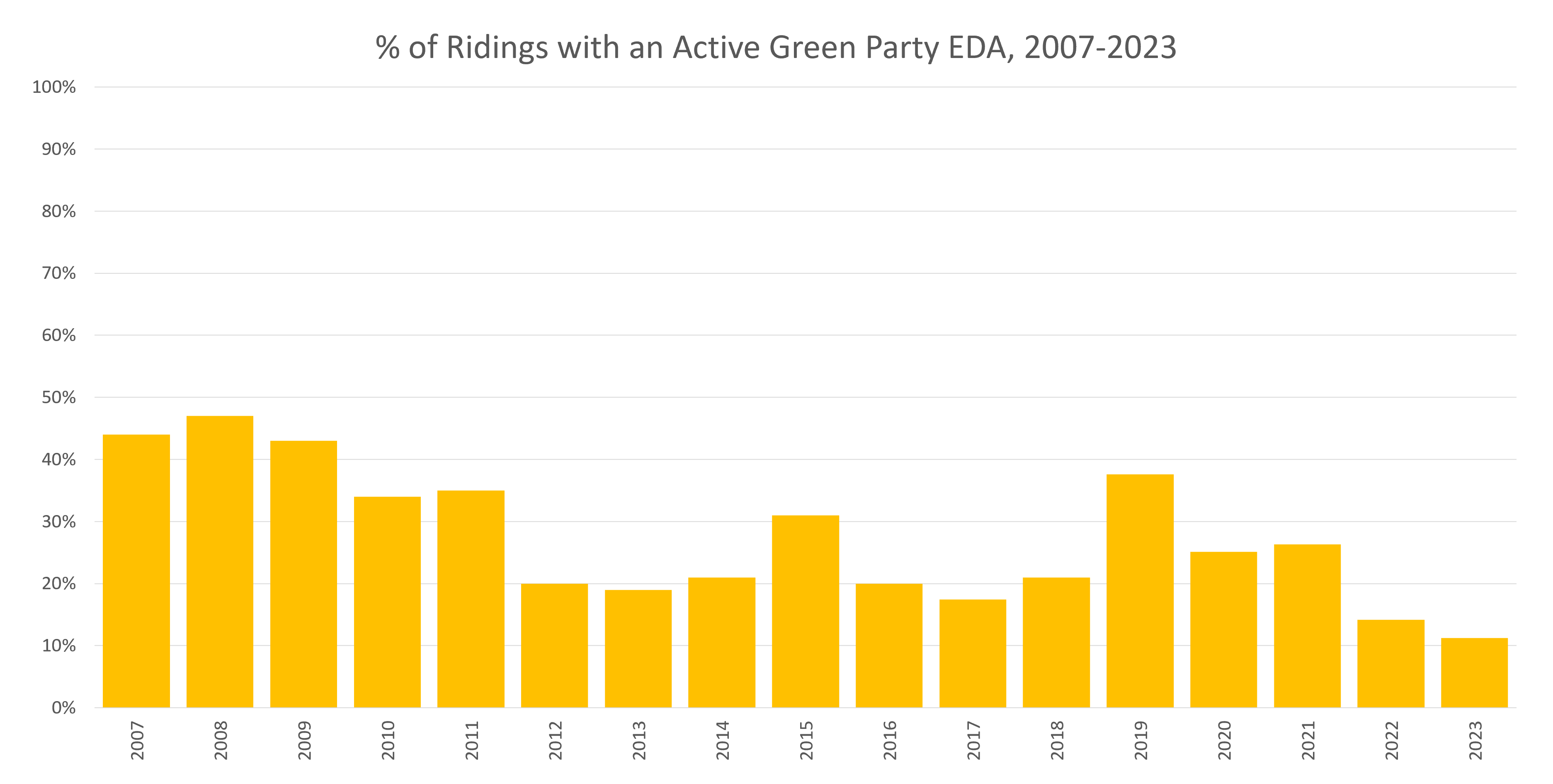 These numbers have never been great, but are now extremely bad. In 89% of Canada’s ridings, the Greens have no active EDA they could build a campaign on.