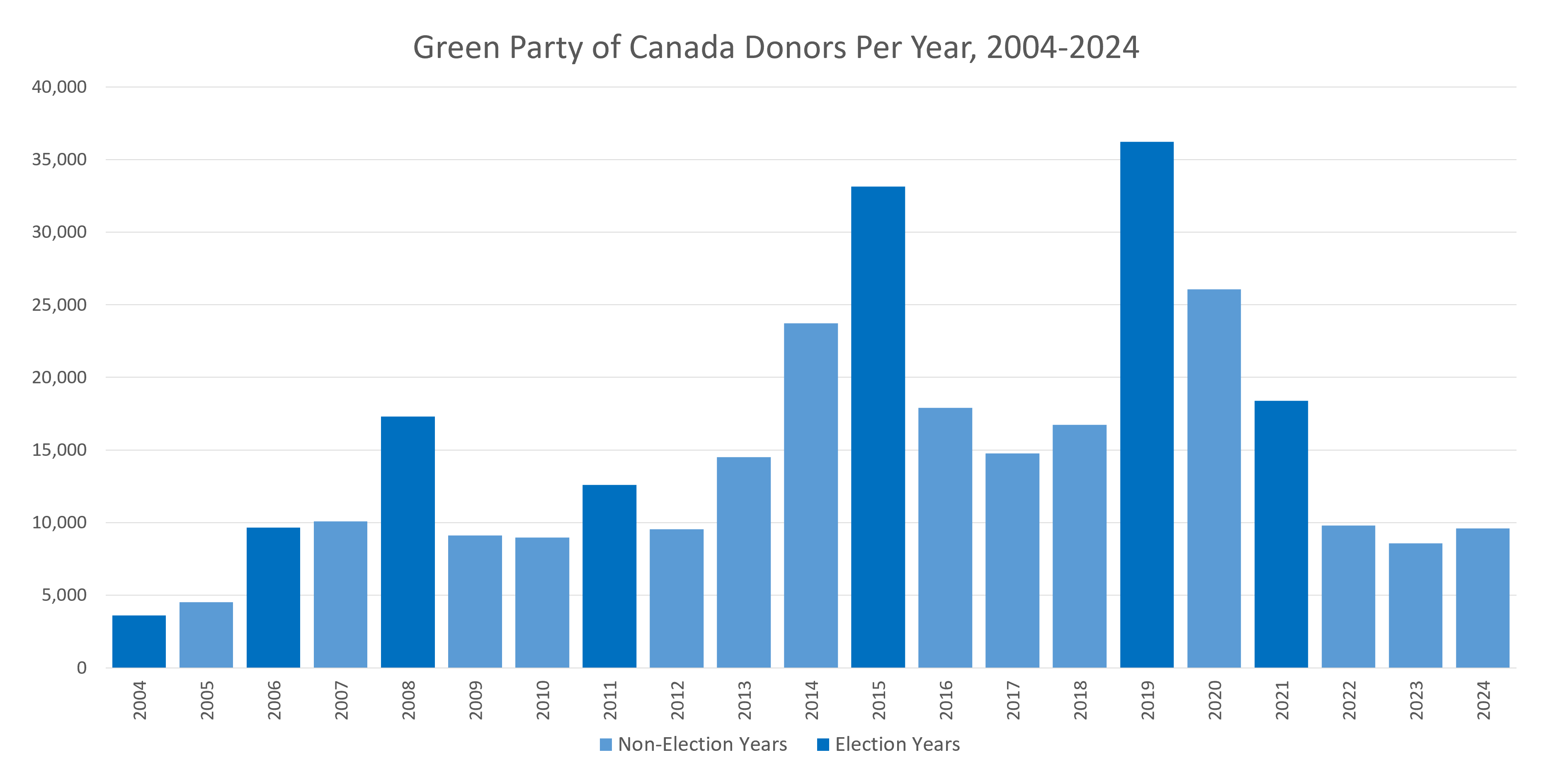 Individual campaign spending has been getting weaker over time as well. Green candidates who spent at least $10,000 on their campaign could be found in 20% of ridings in 2019, but only 10% of ridings in 2021. (Early financial returns for 2025 suggest this trend has continued.)