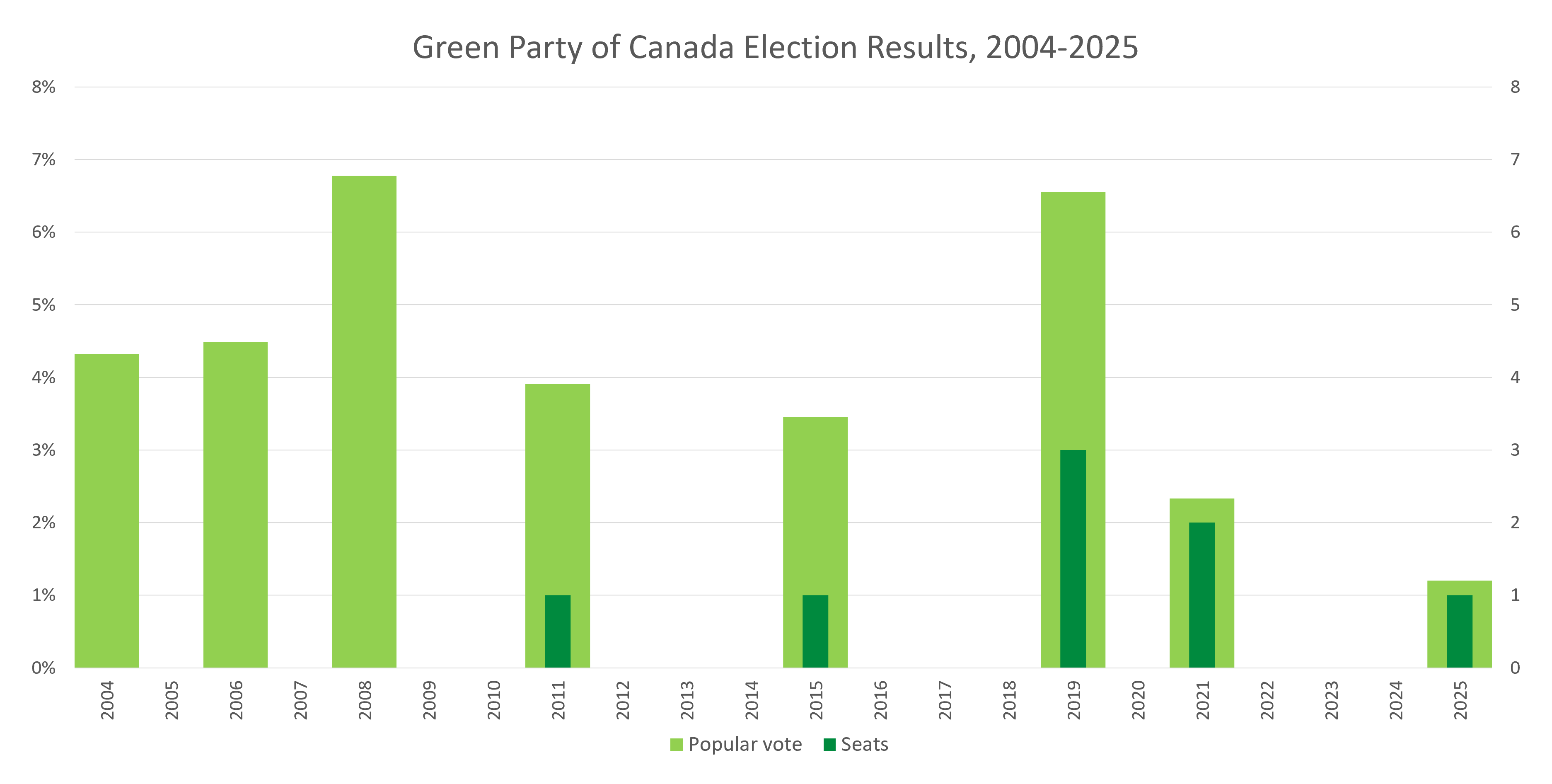 It’s been a tough few years for the Green Party of Canada, and the 2025 election was no exception: after being kicked out of the leader’s debates, the Greens fell to 1.2% popular support and lost MP Mike Morrice by a heart-breaking 375 votes, leaving them once again with Elizabeth May as their only MP.