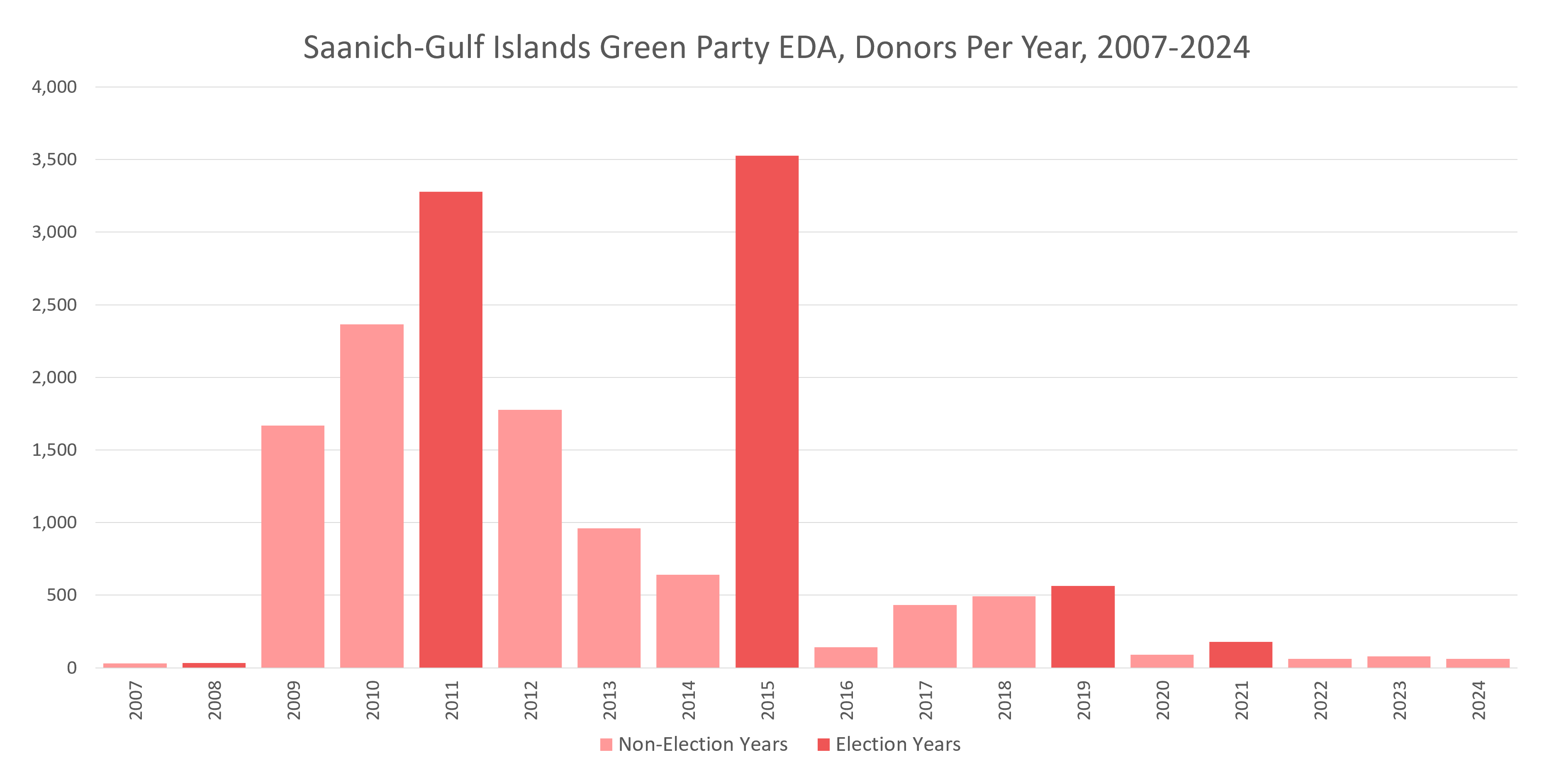 Sources and Methods: All seat counts, popular vote results, donor counts, riding results, and margins of victory or defeat are public information available on Elections.ca or Wikipedia. Where values are given as a % of ridings, this is to compensate for the increasing number of ridings from 2004–2025. Number of candidates: Determined by a count of financial returns. For 2025, by count of the Elections.ca final list of candidates. Donor counts: Taken from annual returns. For 2024, estimated by dividing total donors on Q1–Q4 quarterly returns by 2; this is likely an overestimate. The claim that the party has lost “half of its donors” is true if you compare peak-to-trough for election years or non-election years. If you compare absolute peak-to-trough, the loss is two thirds of donors. Riding associations (EDAs): Number of EDAs determined by a count of financial returns. An EDA was considered “active” if it received one or more donations during the year. Counts of EDAs were divided by the number of ridings to give a percentage. Individual riding data also came from financial returns. Both donors and dollar amounts were included in the table of top EDAs because a healthy EDA requires both. Individual campaign spending: From financial returns, based on campaigns with $10,000+ of direct expenses. Leadership races: Dollars raised and number of donations were calculated by adding donations on candidate financial returns plus “directed donations” from the central party’s financial return. The number of new members in 2020 was verified by comparing vote reports from the party’s online voting system (SimplyVoting) for votes before and after the leadership race, showing an increase in eligible voters (i.e. members). The number of new members in 2022 was too small to reliably calculate in this way. Instead, a list of all donations to leadership contestants was compiled, then compared to all donations to the central party in the preceding two years. Newly-appearing names were treated as new members. (This can potentially overestimate new members, but not underestimate.)
