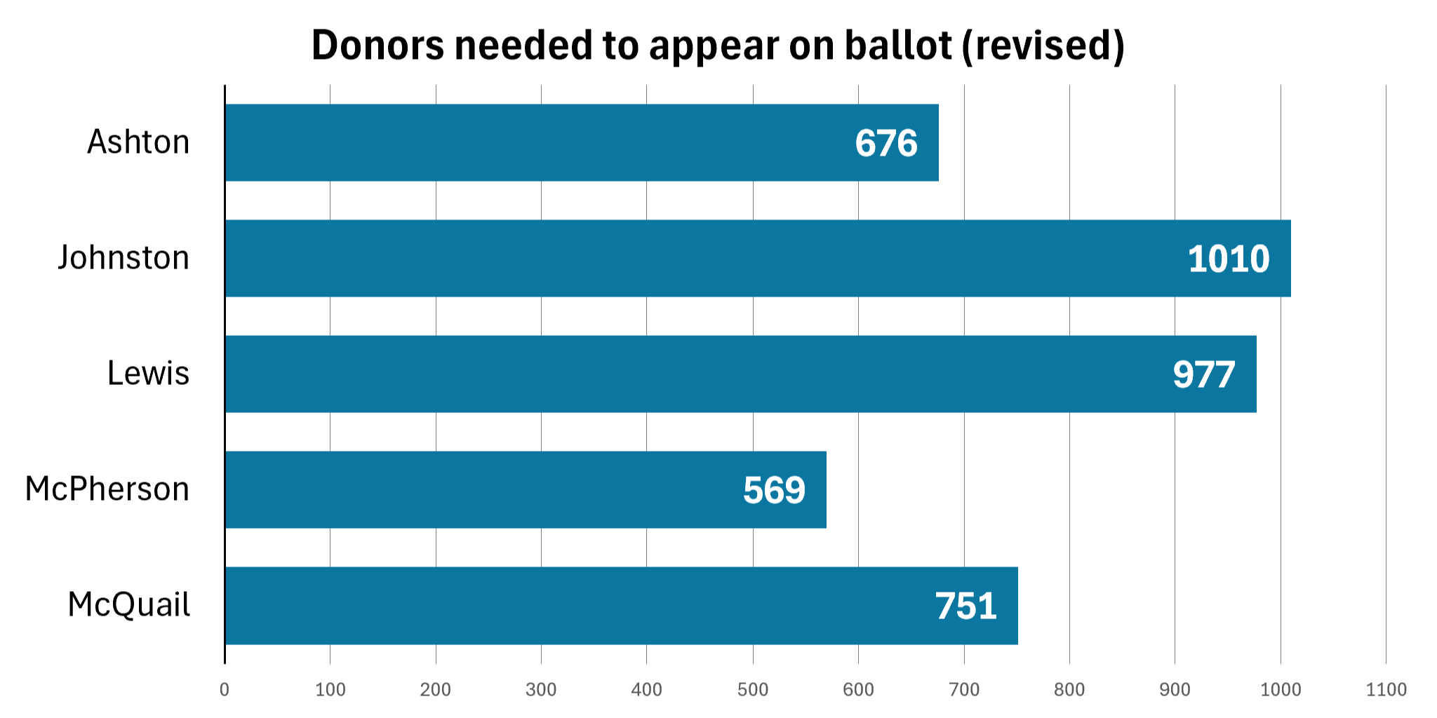 Let’s recalculate how many donors each candidate needed to get on the ballot, taking self-funding into account: