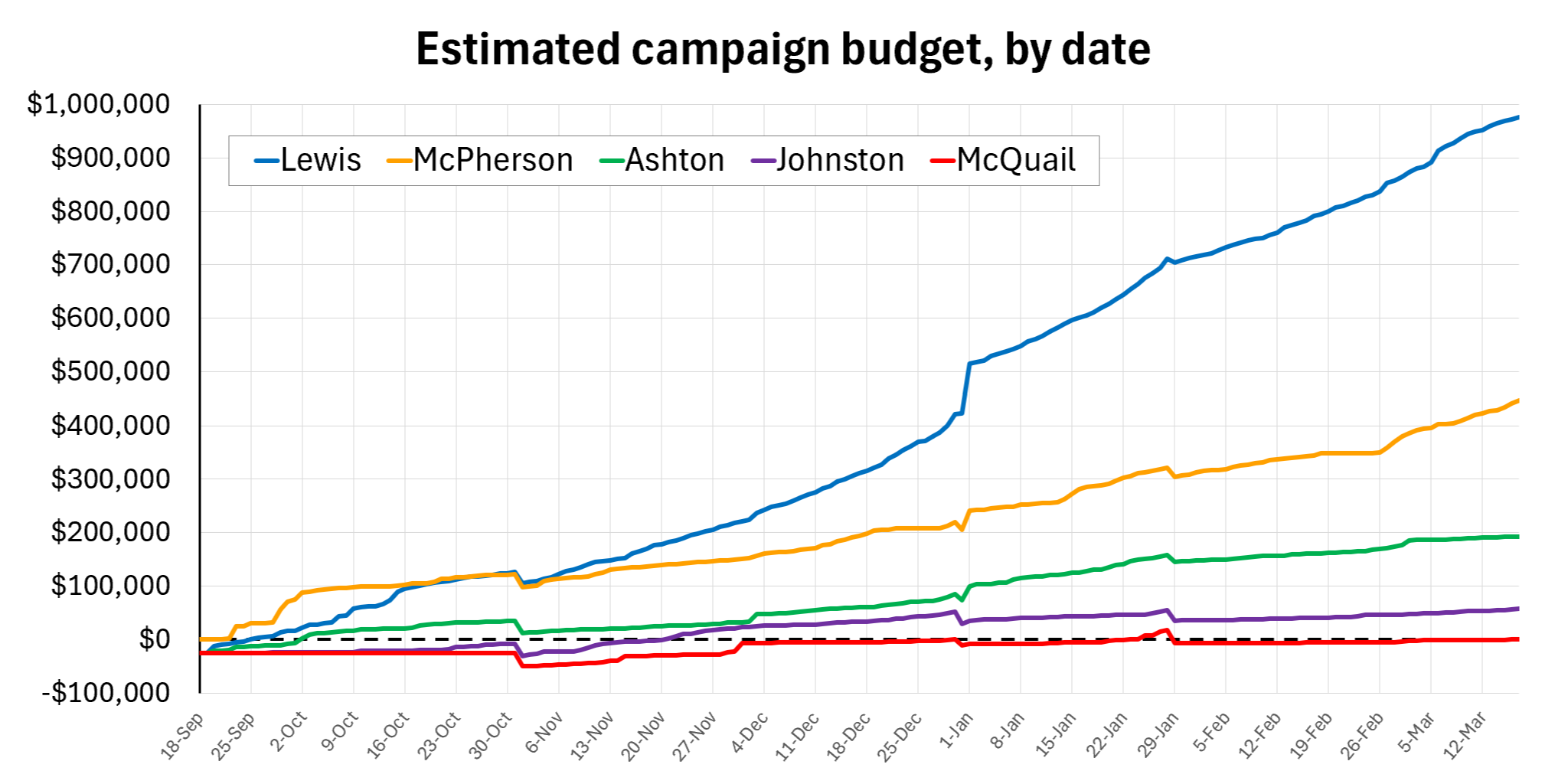 In this graph, we can visualize several of the points made earlier in this post: the McPherson campaign’s head start thanks to a $25,000 self-loan; the Lewis campaign’s exponential growth (spending money to raise money); the constraints facing the Johnston campaign in the first half as most of their budget was absorbed by fees; and the effective disenfranchisement of McQuail’s supporters.