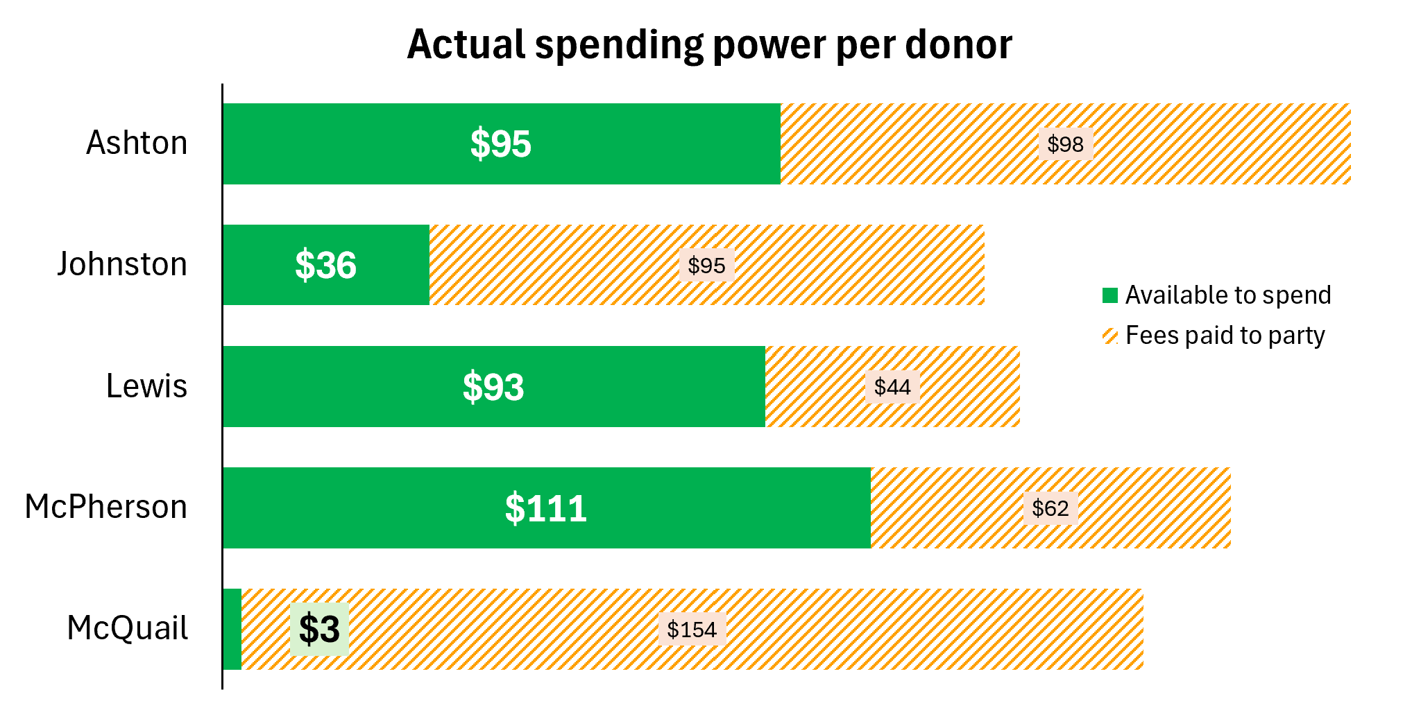 We can see that in 2026, with a higher entry fee, there was about $50,000 less fundraising per campaign, and 6% less money available to spend overall. Had there been a lower entry fee, and thus more money available for outreach, candidates could have raised more for the party—or spent more time engaging members on important issues.